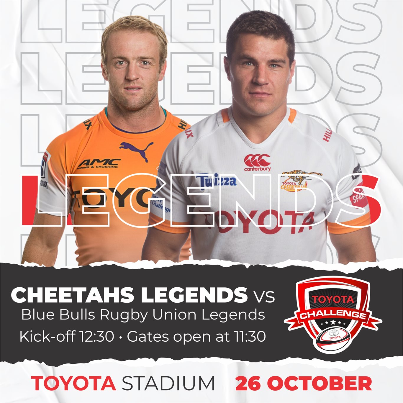 Sunday, 26 October, will feature a curtain raiser between the Cheetahs Legends and the Blue Bulls Rugby Union Legends teams at 12:30. Both games will be live on SuperSport.